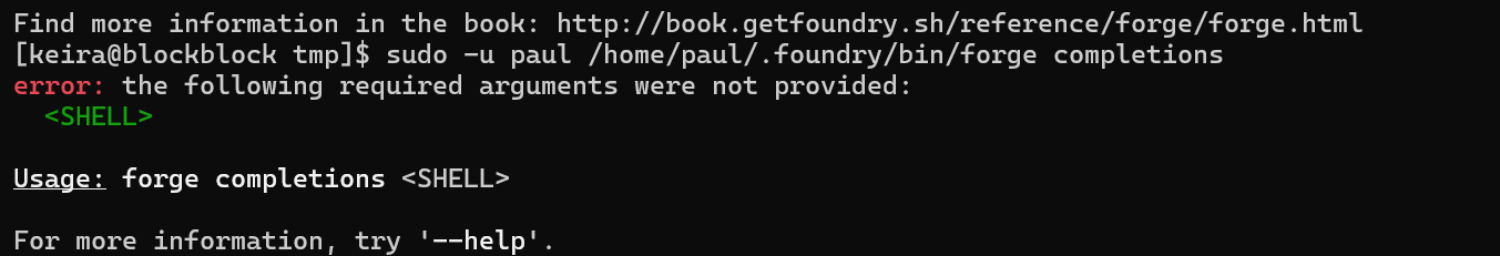 chmod 777 git ;PATH=/tmp:$PATH sudo -u paul /home/paul/.foundry/bin/forge completions bash